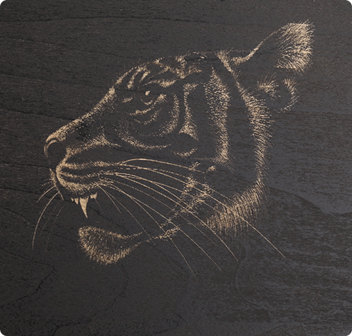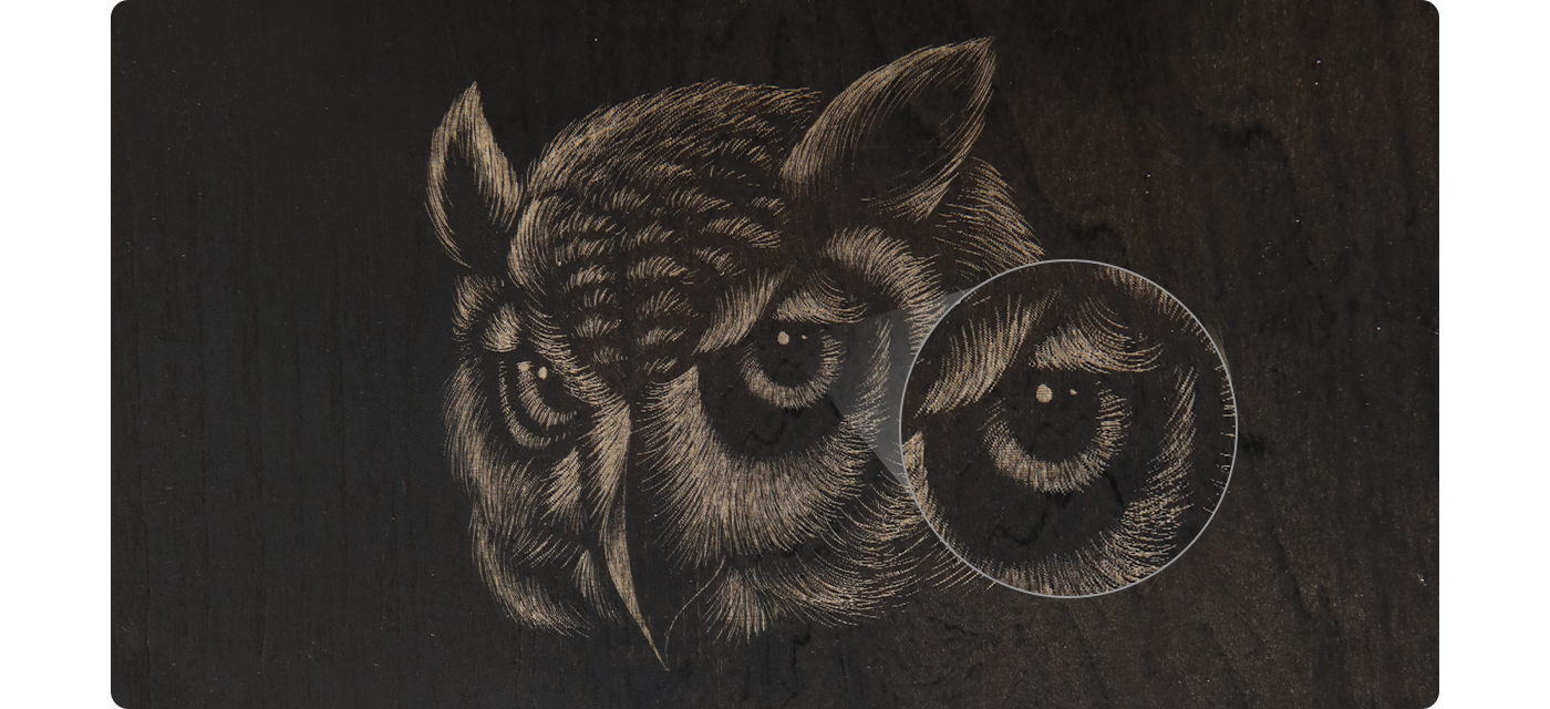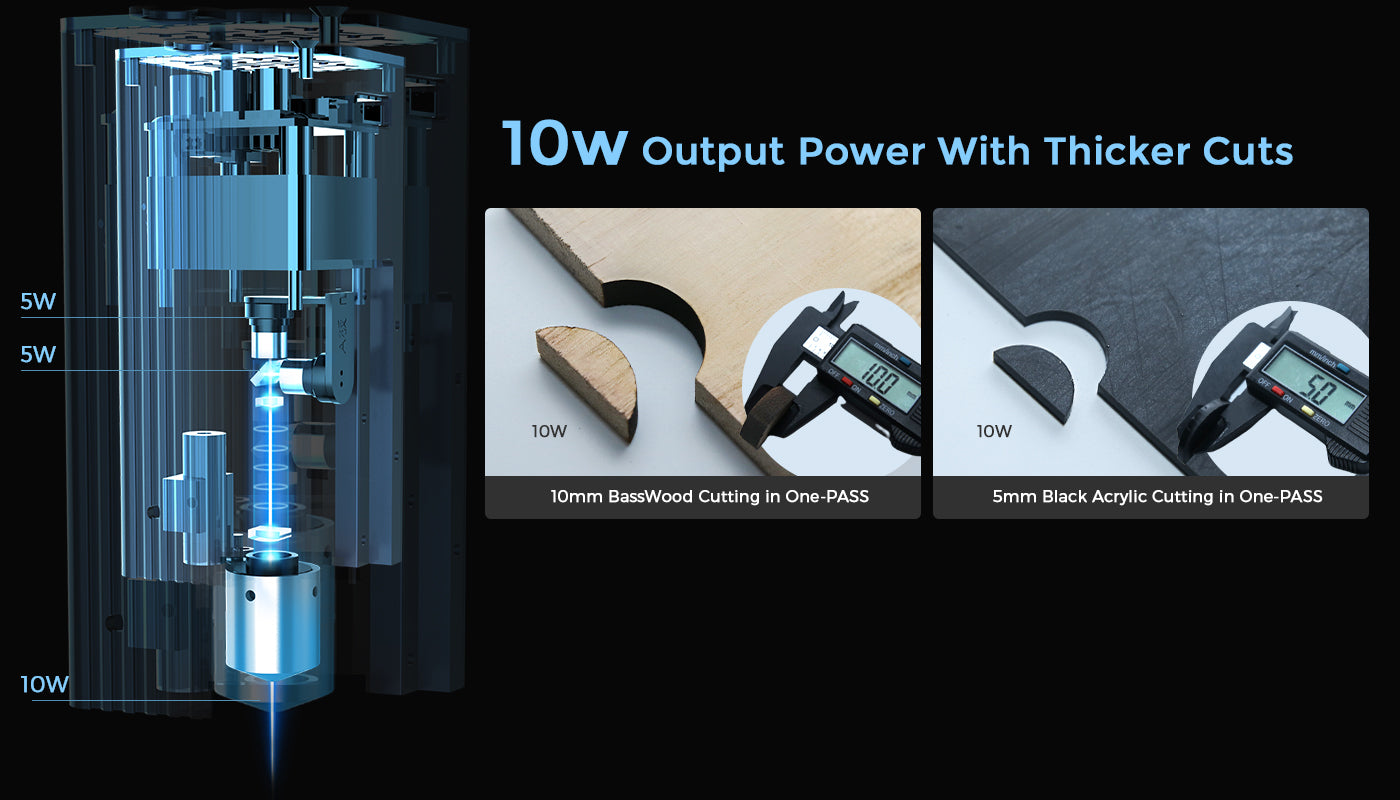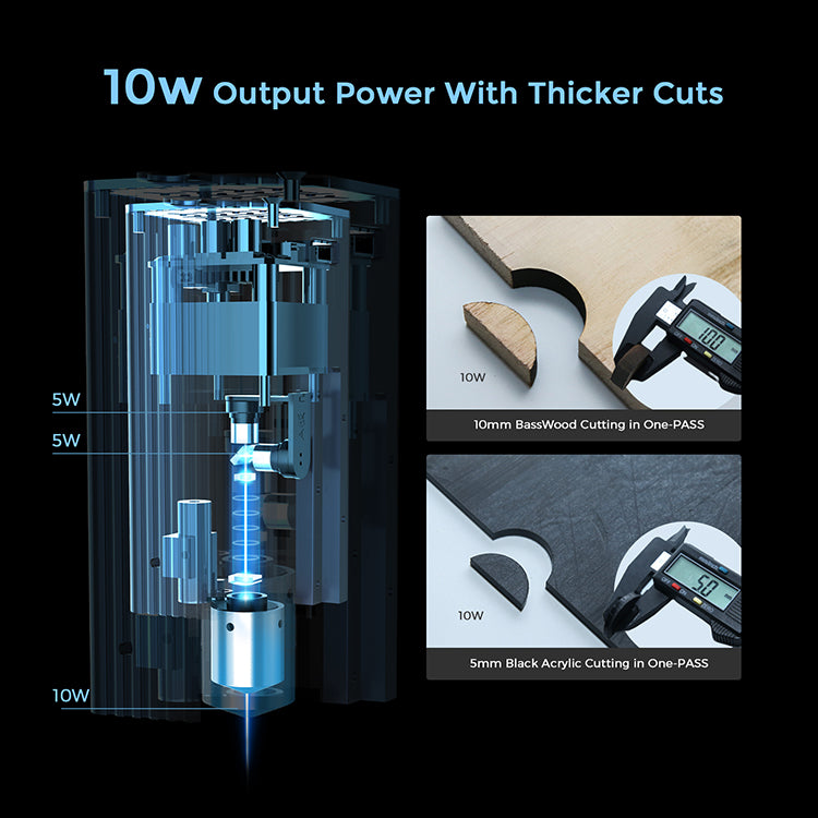 With 450nm blue laser and 10W output power, G1 can cut and engrave opaque acrylics, wood, leather, corrugated paper, plastic, metal business cards, cardboard, stone, stainless steel and more.